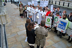 “The climate choir are joined by Climate Change Minister Greg Barker and Chris Huhne, Secretary of State for Energy and Climate Change. 22 November 2011”