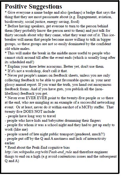 Nigel Rose, who sits on the Stakeholder Steering Group (and MCFly notes with precisely zero surprise that the promised answers to questions have not arrived), gave a presentation on the Manchester Climate Change Action Plan. He pointed out that the second goal of said plan – “culture change” and “carbon literacy” – will not be reached by top-down presentations. That effect was somewhat spoilt by the fact that he gave… a top-down presentation, replete with slides full of text and whizzed-past graphs. The twenty-five minute slot (cut short by technological failure – cheap allegory, anyone?) COULD have been – if negotiated with the organisers – 10 mins of talk and a handout that linked to publicity material, followed by time for small group discussion and q and a. This would rely on the existence of publicity materials, naturally.