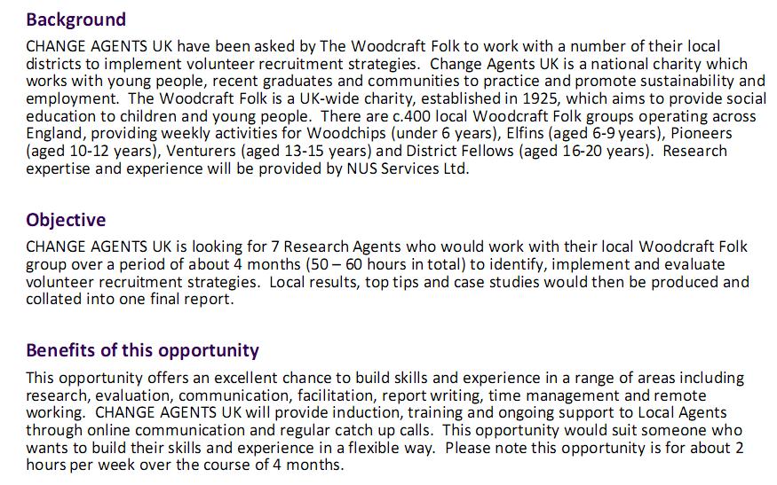 project. Due to the nature of the roles it would ideally suit someone already living in (or at least very near to) one of the local districts – Manchester [etc…] . The role will entail approximately 50 hours work spread over 4 months, could be completed alongside your current studies or other work engagements.
