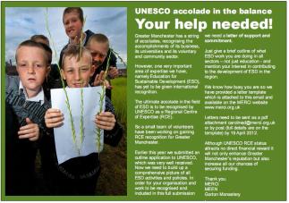 Manchester Environmental Resource Centre Initiative (MERCi) , Manchester Environmental Education Network and Gorton Monastery want people who are doing any or some of the following – In-house awareness raising, Green travel plans, School ground development, Whole school Sustainability plans, Energy audits, Carbon Literacy programmes (etc!) – to write a letter and send it to MERCi by Thursday 19th April. (see sample below). These letters will then be sent on to the United Nations Educational, Scientific and Cultural Organisation, in the hope that Greater Manchester will be recognised as a “Regional Centre of Excellence.”