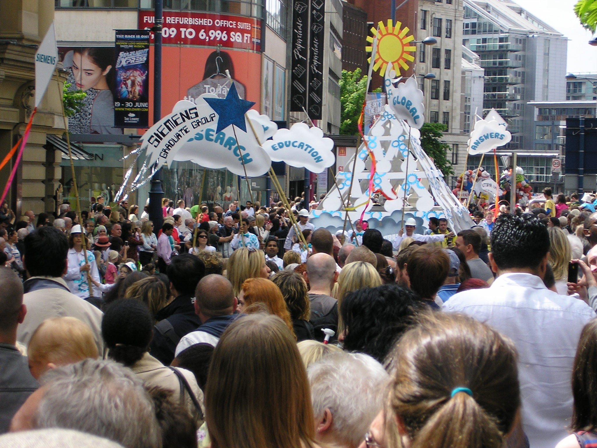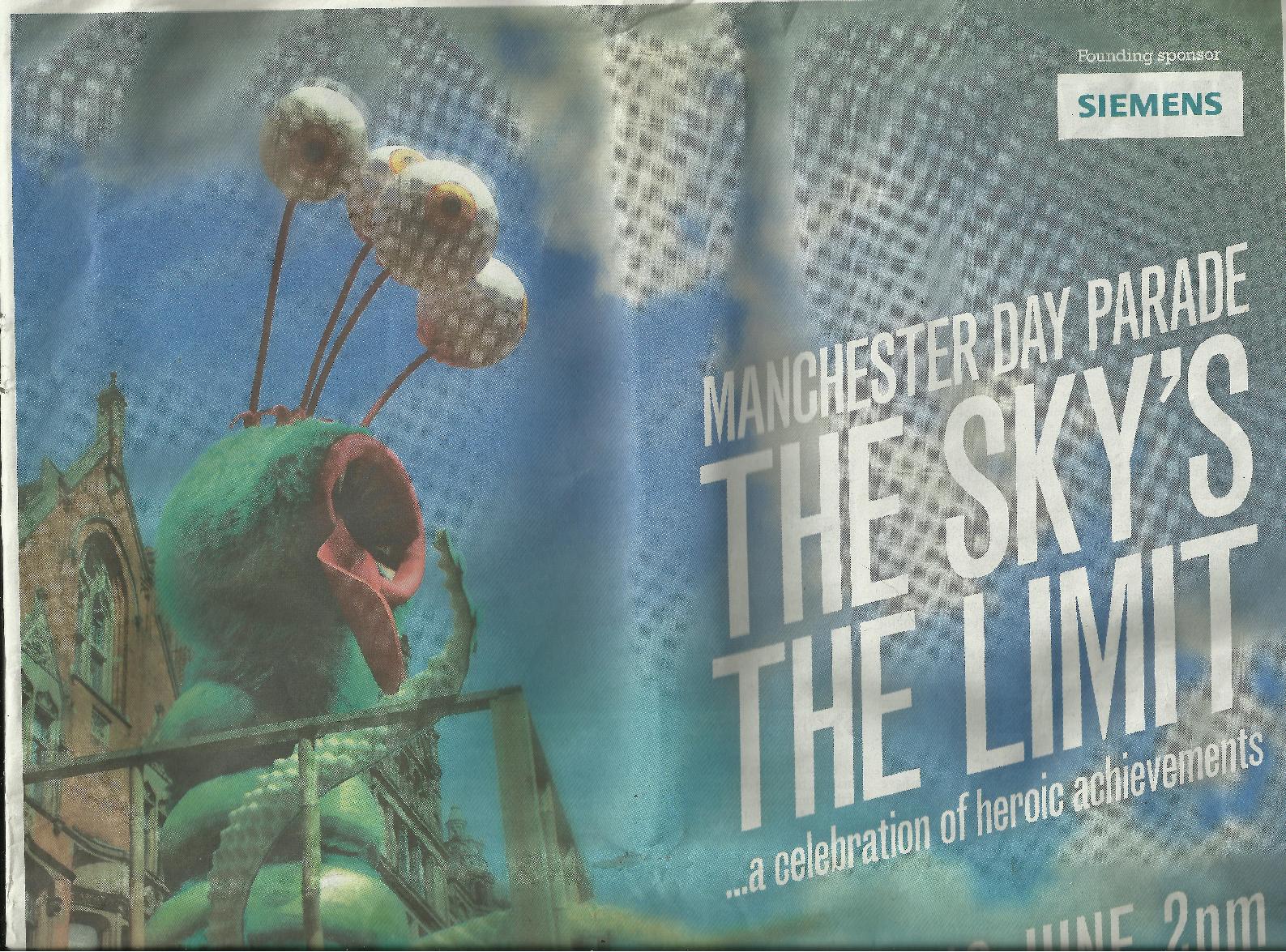 What’s with that thing on the publicity for the parade? It has a green coating, but if you look closely at where it gets its energy, it’s all red and fangy. Big eyes looking everywhere for enemies and snacks, and tentacles reaching out to devour anything it can get hold of. But enough about Manchester City Council – clock the weird shapeless thing!