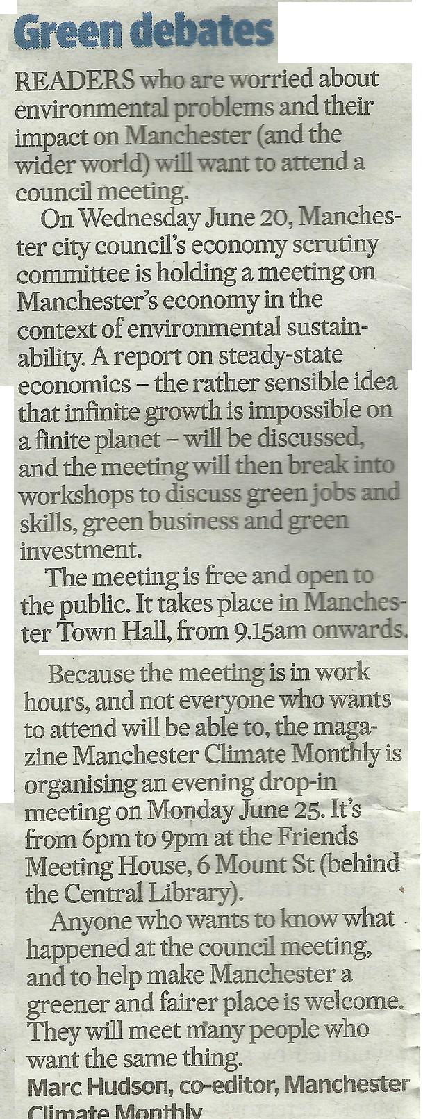 Next Wednesday, June 20, councillors and citizens will discuss a report about Steady-State economics, at Mancheser City Council’s “Economy Scrutiny Committee.” (See below for details)