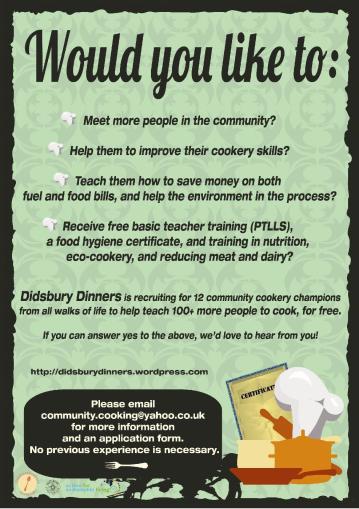 To apply to be a Volunteer Community Cookery Champion, please email us your completed application form and equality monitoring form (available from http://didsburydinners.wordpress.com/communitycooking/) by 22 July 2012. Please note: if we receive a large number of applicants, we will close the application process before this date.