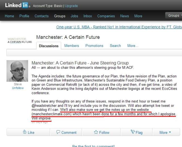 [In a post on linked-in on June 26th, Mr Connor wrote “We’ll also make sure we get the notes up on the website (manchesterclimate.com) which hasn’t been done for a few months and for which I apologise. Will improve.” Our phone call was on July 10. Today, July 25th – still no minutes on the website. Or if they are up, they’re very well hidden. No blog posts since January, of course.]
