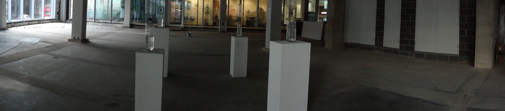As you enter the space (a bare ground-floor office opposite Piccadilly Railway Station- MAP) the first thing you see is two buckets dangling just off the floor. On the ropes suspending them are inverted bottles of water, with nozzles that release a droplet every few seconds. The “plink” of droplets reverberates as you walk around the cavernous space. It’s an effective way of getting you to think about the passage of time (and time running out!).