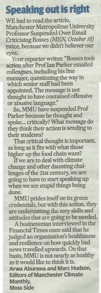 The Manchester Evening News published a letter of ours on Tues 23rd. We wrote it to support Professor Ian Parker, who has been suspended by his employers for, um, thinking critically. You can read more about it here, and, if you wish, sign the petition.
