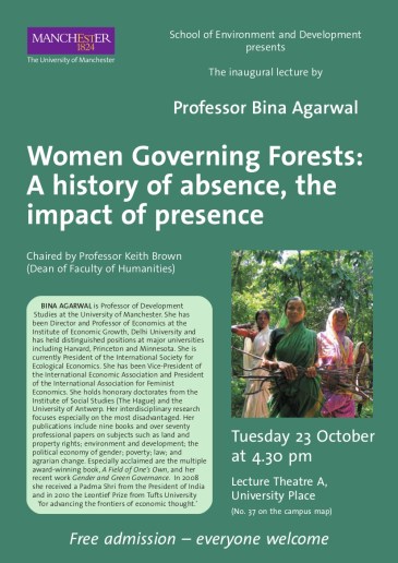Manchester’s environmental community has a wonderful new asset, Bina Agarwal Professor of Development Economics and Environment at Manchester University. Her inaugural lecture this October, with the lovely title above, was inspiring in terms of its jargon-free accessibility, gender, equity and environmental analysis. Bina pointed out that economists studying environmental collective action and green governance have paid little attention to the question of gender. While women worldwide are the principal gatherers of fuel and food from forests and are very knowledgable about forests generally this is not recognised and it is assumed that people or villagers are the ‘experts’.