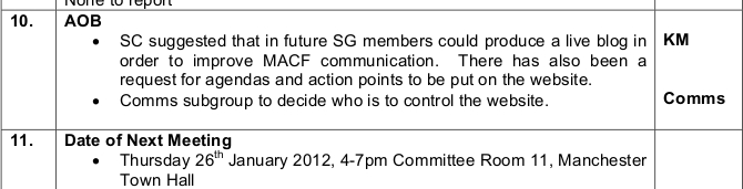 The irony is that the “request for agendas and action points” was from one of the MCFly editors. The response from the Steering Group was not to post ANY minutes in 2012, despite having posted the 2010 and 2011 minutes. That’ll teach us for asking, eh? This, apparently, is how democracy and transparency is done in Manchester…