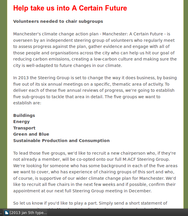 In response to persistent requests from Manchester Climate Monthly, the Steering Group will be releasing answers to “some” questions about its new sub-group chairs, and perhaps – if we are very lucky – the “democratic” structures that are to be in place for its next conference in March (1) . The website – manchesterclimate.com, has had a