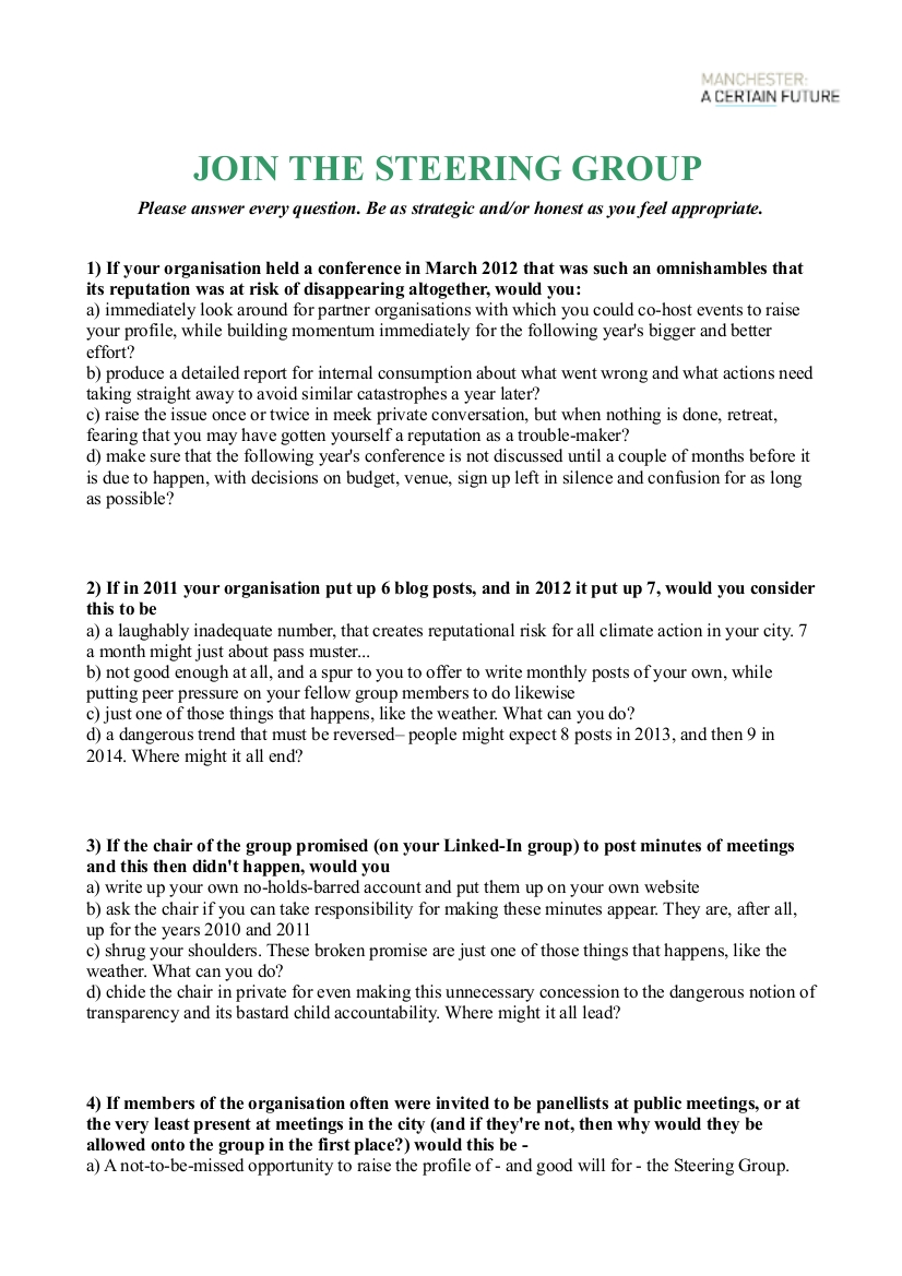 What a coincidence! On the very day that more information is finally released about the upcoming and ever-shrinking “Stakeholder Conference” [see here] on climate change, a plain brown envelope arrived at our offices, containing a bombshell. It appears to be the new recruitment questionnaire for the Steering Group that is mis-organising the event. Our mysterious source has also helpfully included the scoring table, so you can see how you will fare. If any readers of MCFly get onto the Steering Group (elections are supposed to be held), we remind you that you got your head-start in life thanks to this blog post.