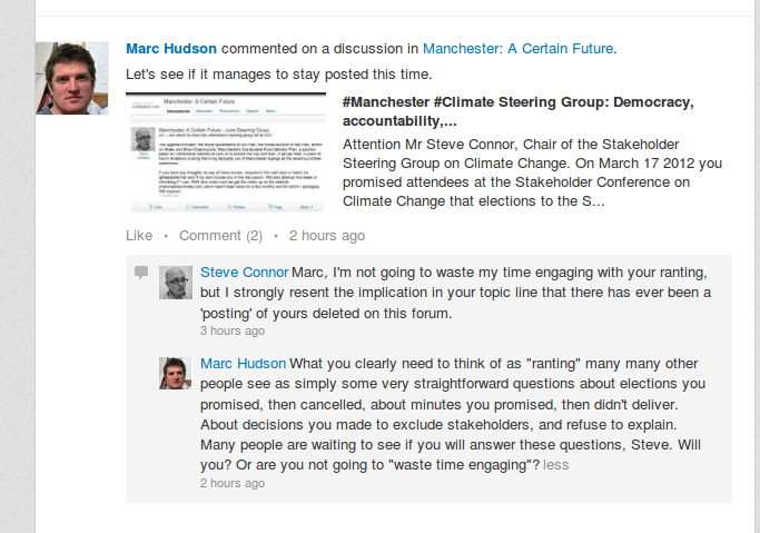 The Stakeholder Steering Group contains roughly thirty people. For the privilege of being part of it, they could at least be communicating what they are doing. One of the goals of the “key early actions” of the Action Plan ws to “create visible public promotions so people can follow progress on carbon reduction.”  The official manchesterclimate.com website has had, in the last two years,  13 blog posts. This is unacceptable. This sends a message of lack of seriousness and failure about the most important long-term issue facing us.