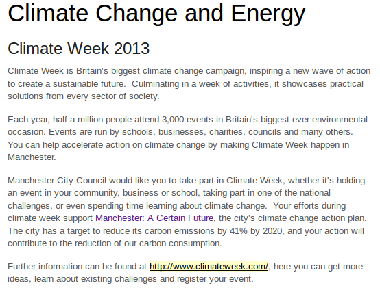 The Manchester Climate Change Action Plan (also known as “A Cre.. Certain Future”) has two headline goals. The first is to reduce carbon emissions by 41% by 2020. This was what the science was saying we needed to do back in 2009, when the Action Plan was written. The science has moved on, but that goal remains the same. (1)