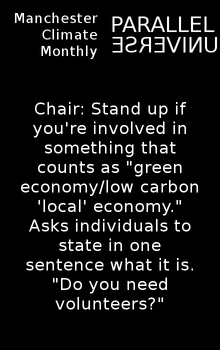 The event was organised by Manchester Green Party (2). Their new National Leader, Natalie Bennett, was in town (3) and was joined on the stage by Neil McInroy of the Centre for Local Economic Strategies (CLES). In a parallel universe, with the same space, time and money, the event could have been a thing of beauty and influence.