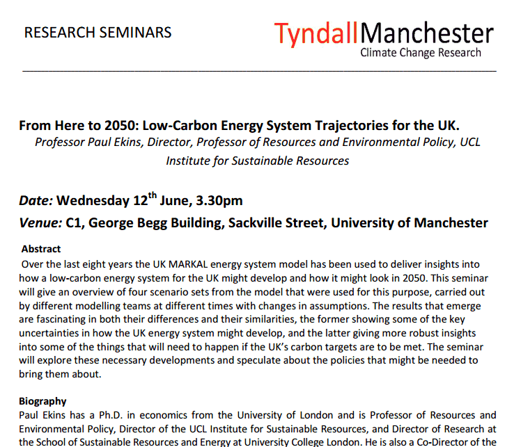 ‘From Here to 2050: Low-Carbon Energy System Trajectories for the UK’ by Professor Paul Ekins, Director of the UCL Institute for Sustainable Resources at University College London on (room C1, George Begg Building, Sackville Street).