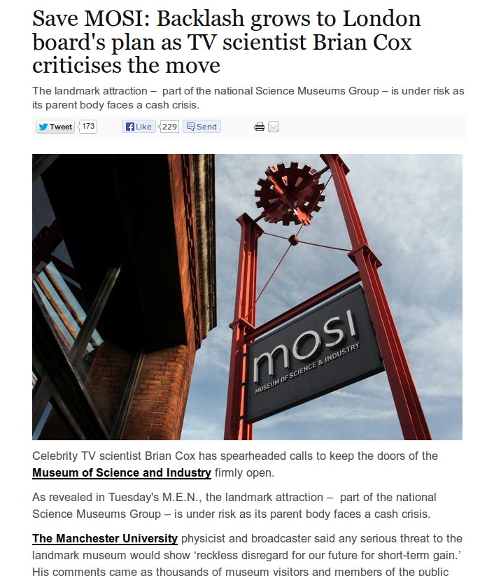 For those of you not lucky enough to buy the Manchester Evening News every day; there’s been a campaign by them about a possible threat to close the Museum of Science and Industry. Is it pre-next-round-of-cuts brinkmanship? Is it an effort to soften everyone up for entry charges? I don’t know.