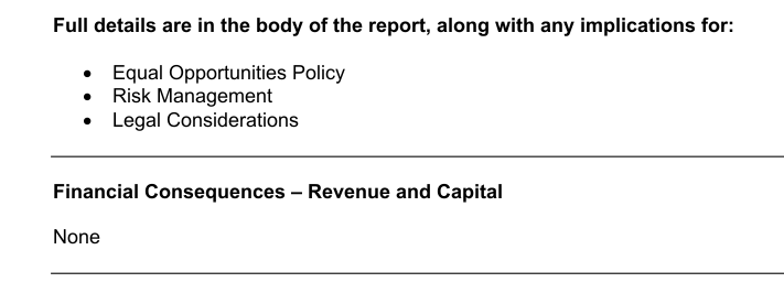 At a Scrutiny Committee meeting earlier this year there had been a proposal – that caused some excitement – that reports should not just name potential implications for the Council’s goals around Equal Opportunities Policy, Risk Management, Legal Considerations and the like, but also environmental goals. No progress yet on this, it seems (the screen grab below is from item 15). It’s the silences you have to listen to…