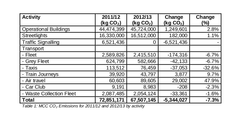 Last year’s official plan spoke of a 10% reduction target in the Council’s own emissions, as part of the wider “Manchester Climate Change Action Plan” created in 2009. The “achieved” result was a 7% reduction. On closer examination however, much of this reduction is due to an accounting measure.
