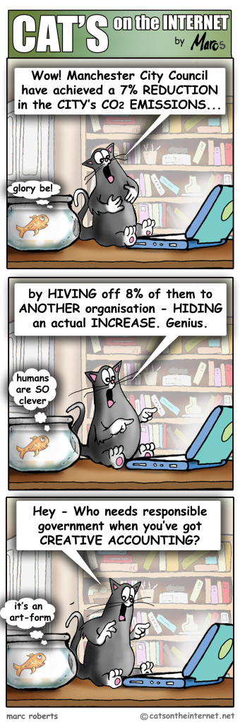 Delilah (that’s the cat) has clearly been reading this analysis of Manchester City Council’s Annual Carbon “Reduction” Plan… Tomorrow that plan comes under scrutiny, at a free and public meeting. Starts 2pm, Committee Room 11, Manchester Town Hall.