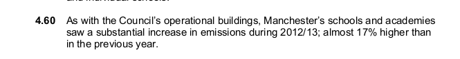 Tomorrow the Neighbourhoods Scrutiny Committee looks at the Annual Carbon “Reduction” Plan of Manchester City Council. The headline claim is that a 7% reduction in carbon dioxide emissions was made the last year. Reading the fine print (always advisable) reveals that this 7% “reduction” is entirely down to traffic signage no longer being on Manchester City Council’s carbon “books.” In fact, but for this piece of accounting luck, emissions would have been UP by over 1%. Still, increase pales into insignificance compared with this, grabbed from the 2013/4 plan –