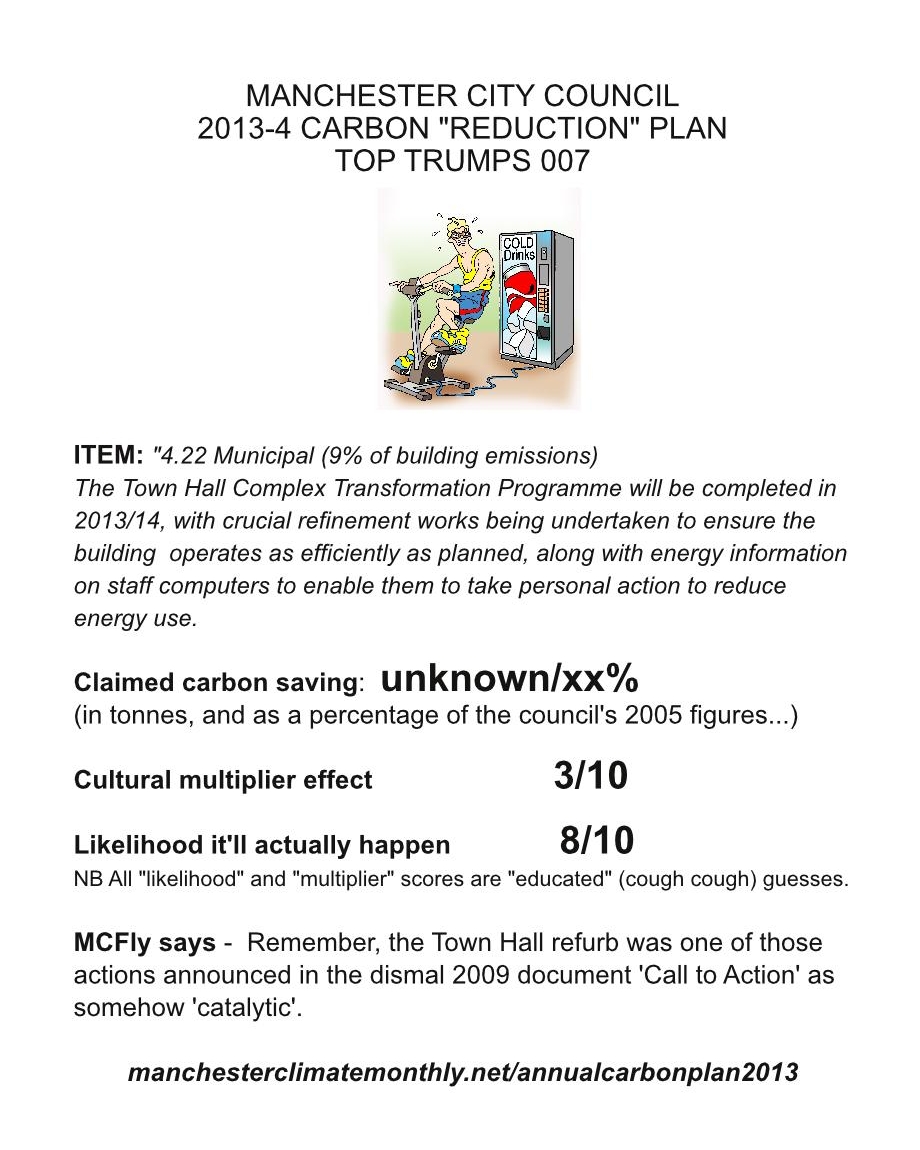 In 2012 Manchester City Council aimed for a 10% reduction in its own emissions. In July 2013 it claimed a 7% reduction. It was able to do this because responsibility for traffic lights moved from its books. Looking at everything else (buildings, transport) emissions went … UP by 1.8%.