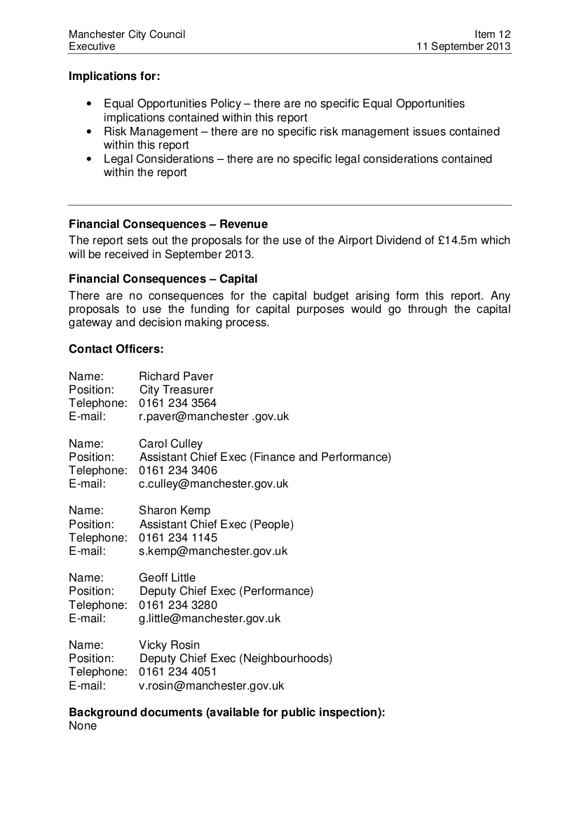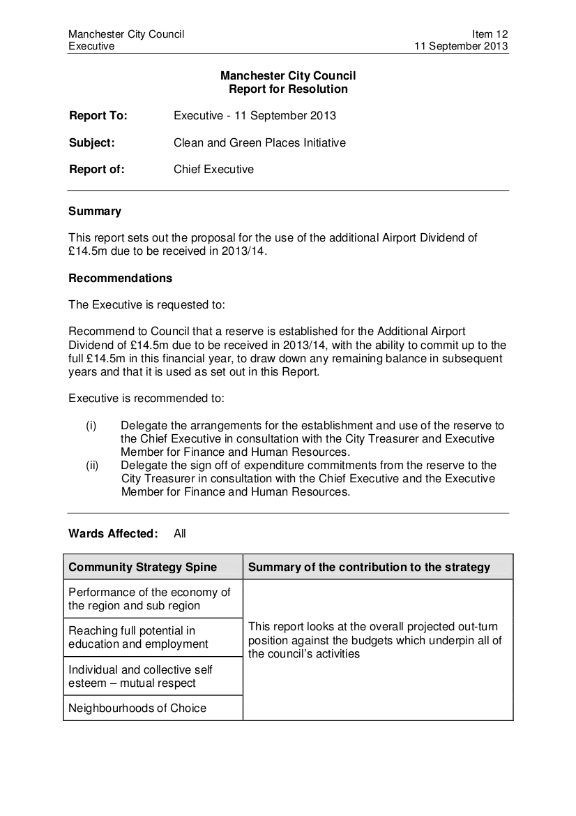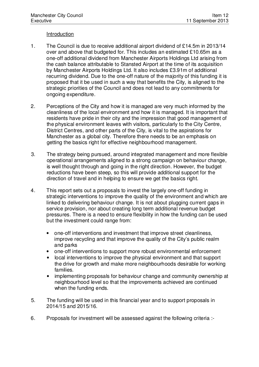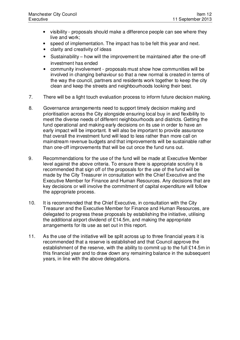 “Recommendations for the use of the fund will be made at Executive Member level against the above criteria [of “visibility,” “speed of implementation,” “sustainability” and “community involvement.”] To ensure there is appropriate scrutiny it is recommended that sign off of the proposals for the use of the fund will be made by the City Treasurer in consultation with the Chief Executive and the Executive Member for Finance and Human Resources. Any decisions that are key decisions or will involve the commitment of capital expenditure will follow the appropriate process.”