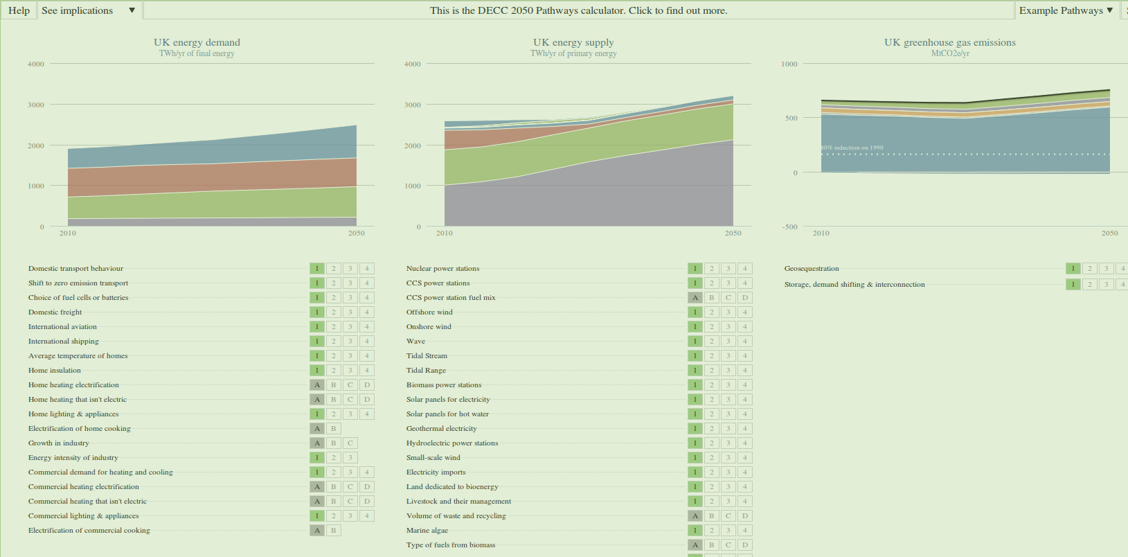 The tool (excitedly an open source project – whoop!) allows the user to model the two sides of the 2050 challenge: reducing energy demand on one side and increasing renewable and low-carbon energy generation on the other. With 42 ‘levers’ the user can create a series of energy scenarios, game playing to meet the UK’s energy needs and importantly its carbon emission reduction targets.
