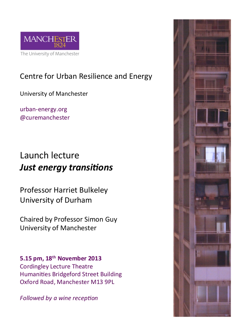 So it was very timely that Stefan Bouzarovski arrived in time to be the incoming director of the Centre for Urban Resilience and Energy (“CURE2”) – whose agenda of resilience, vulnerability, transitions, social learning, institutional analysis etc, fits very well with the current wave of thinking both in Manchester and generally.