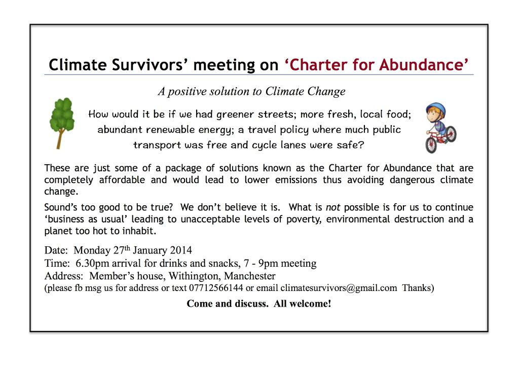 The way to contact us is by emailing climate survivors@gmail.com or joining the site climatesurvivors.ning.com (this site is now devoted to developing our Charter for Abundance but also has meeting information). Like our page on Facebook ‘Climate Survivors’ and/or tel. 07712566144.