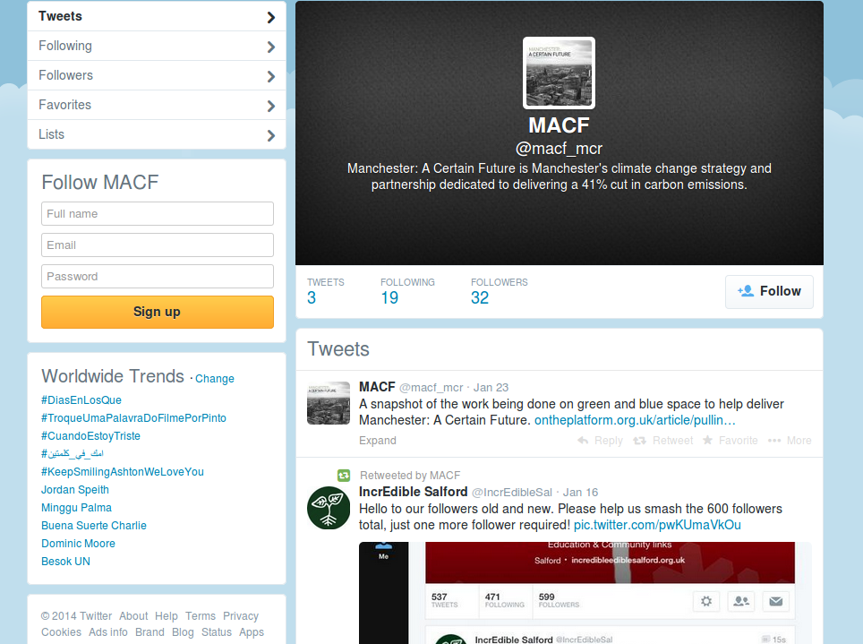 The high-profile and high-impact Steering Group for the Manchester Climate Change Action Plan has set up a Twitter account on January 17th. They managed a “hello look at us” tweet, a retweet and one twet on January 23rd. Since then, nowt.