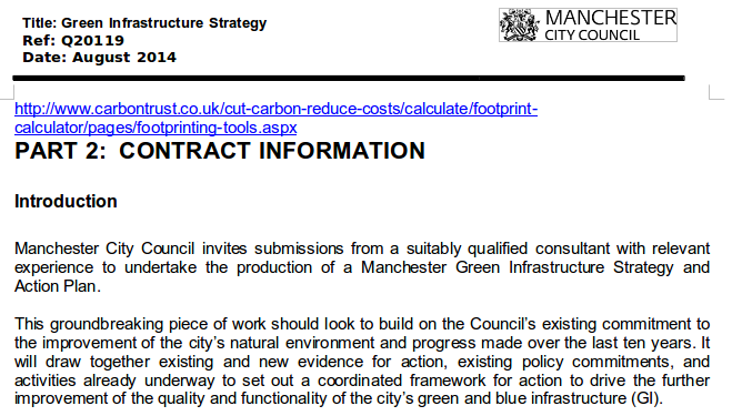 Manchester City Council’s environmental strategy team has invited outsiders to write its Green Infrastructure Strategy. It is looking for a “suitably qualified consultant with relevant experience to undertake the production of a Manchester Green Infrastructure Strategy and Action Plan.”