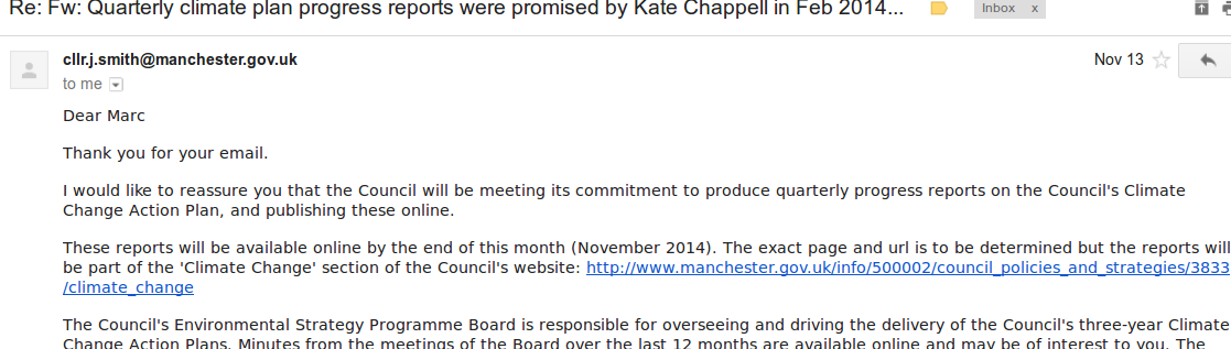 On November 13th, two weeks after Manchester Climate Monthly had started publishing daily examples of the Council’s broken climate promises, the Executive Member for Housing and Regeneration (1) Councillor Jeff Smith, wrote an email to several people. In it he promised that, “by the end of this month,” the first quarterly progress report would be up.