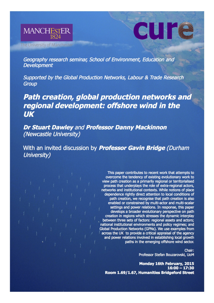 The Centre for Urban Energy and Resilience at the School of Environment, Education and Development (University of Manchester) is co-hosting this event with the Geography research seminar series and the Global Production Networks, Labour & Trade Research Group: Path creation, global production networks and regional development: Offshore wind in the UK