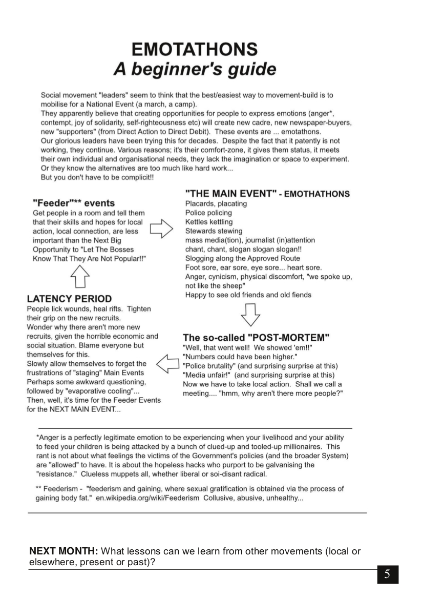 On a side note… or perhaps a roundabout return to the actual point: I never really got into emotathons – it always felt like an entree for which the main course was never delivered, and the bitter emptiness felt like a dessert was probably due too. I looked inside myself for the source of this emptiness and found a hunger for something more tangible and less symbolic – a hunger that cannot be satisfied with placard-waving and chants that dissipate energy that could be funneled and filtered into useful channels, many of which already exist and are all set to receive new and willing helping hands…