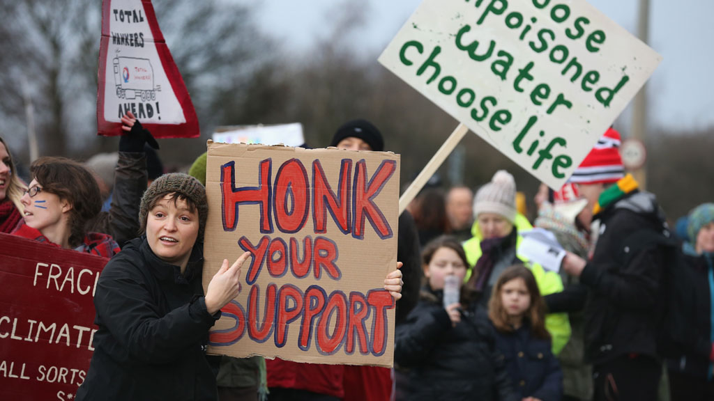 SALFORD, ENGLAND – JANUARY 26: Environmental campaigners take part in a protest march near to the IGas Barton Moss fracking exploration rig on January 26, 2014 in Salford, England. Environmental protestors and anti gas fracking campaigners from across Britain marched to the Barton Moss gas exploration site run by Energy company IGas from Salford City Stadium. (Photo by Christopher Furlong/Getty Images)