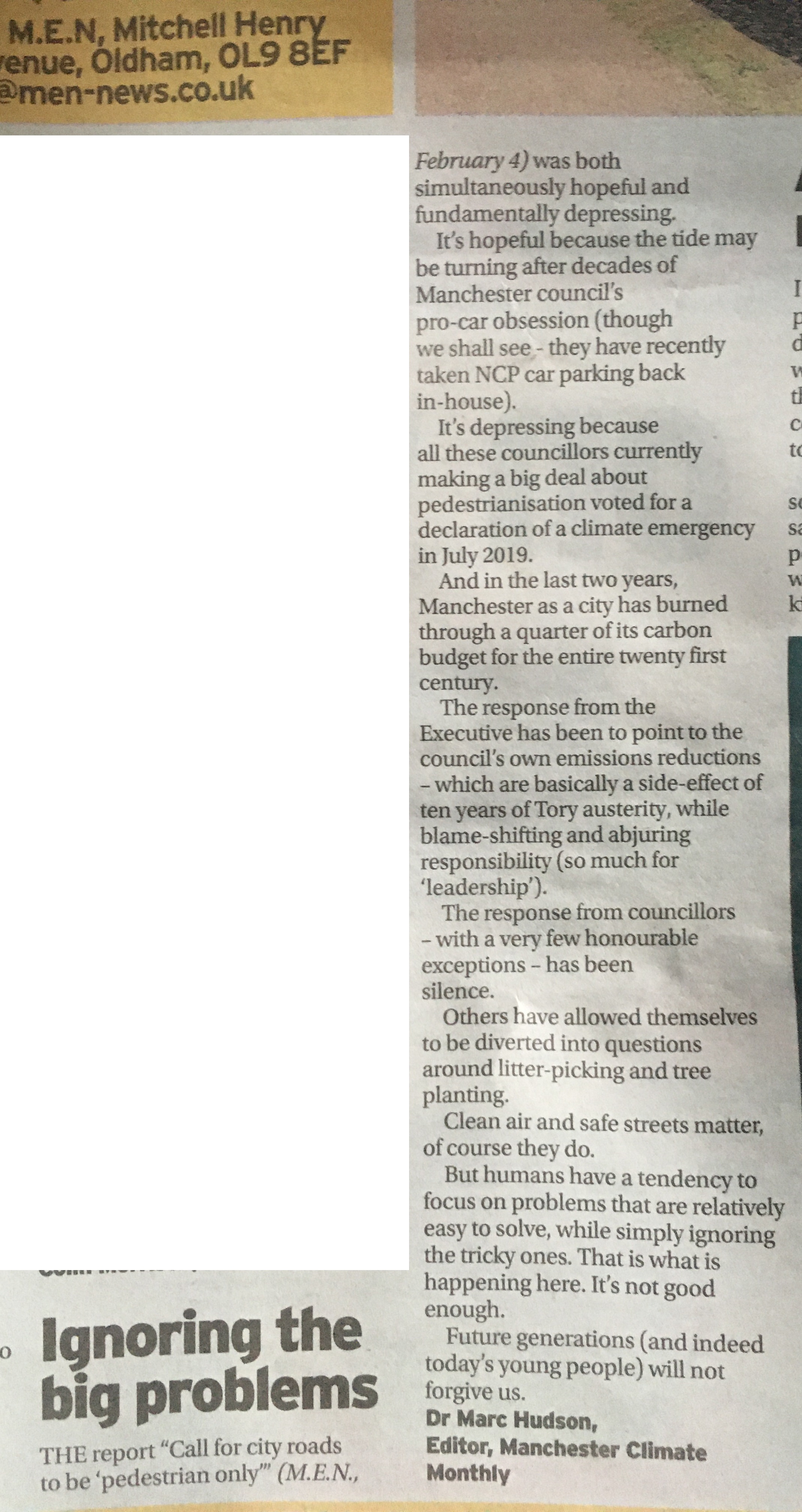 It’s depressing because all these councillors currently making a big deal about pedestrianisation voted for a declaration of a climate emergency in July 2019.  And in the last two years, Manchester as a city has burned through a quarter of its carbon budget for the entire twenty first century.