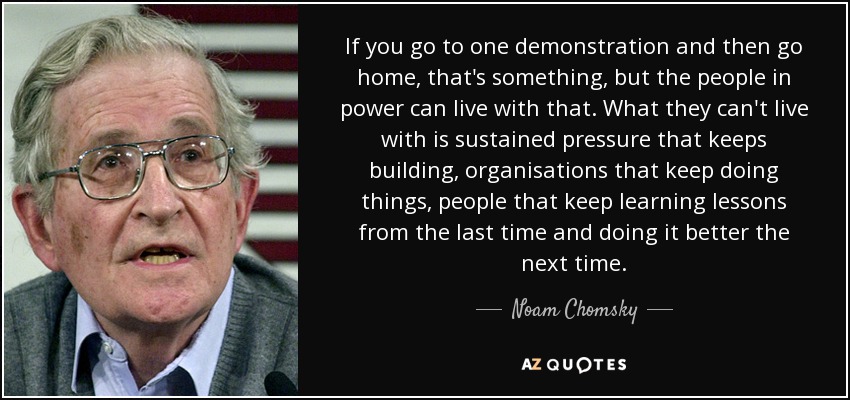 On Monday, one of my few heroes, Noam Chomsky, is giving a talk on Democracy, Neoliberalism and Climate Change. I’ve written about that on Climate Emergency Manchester (I am a member of the core group). I’ll end this post with a quote of Chomsky’s that has always made enormous sense to me, and that I’ve tried to use as a guide to how I “do” my citizenship, and how I try to encourage/enable/support/hector other folks to do theirs.