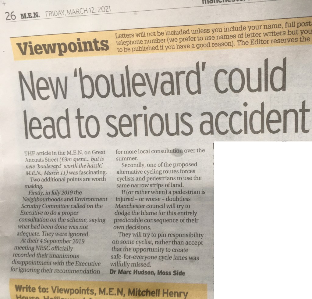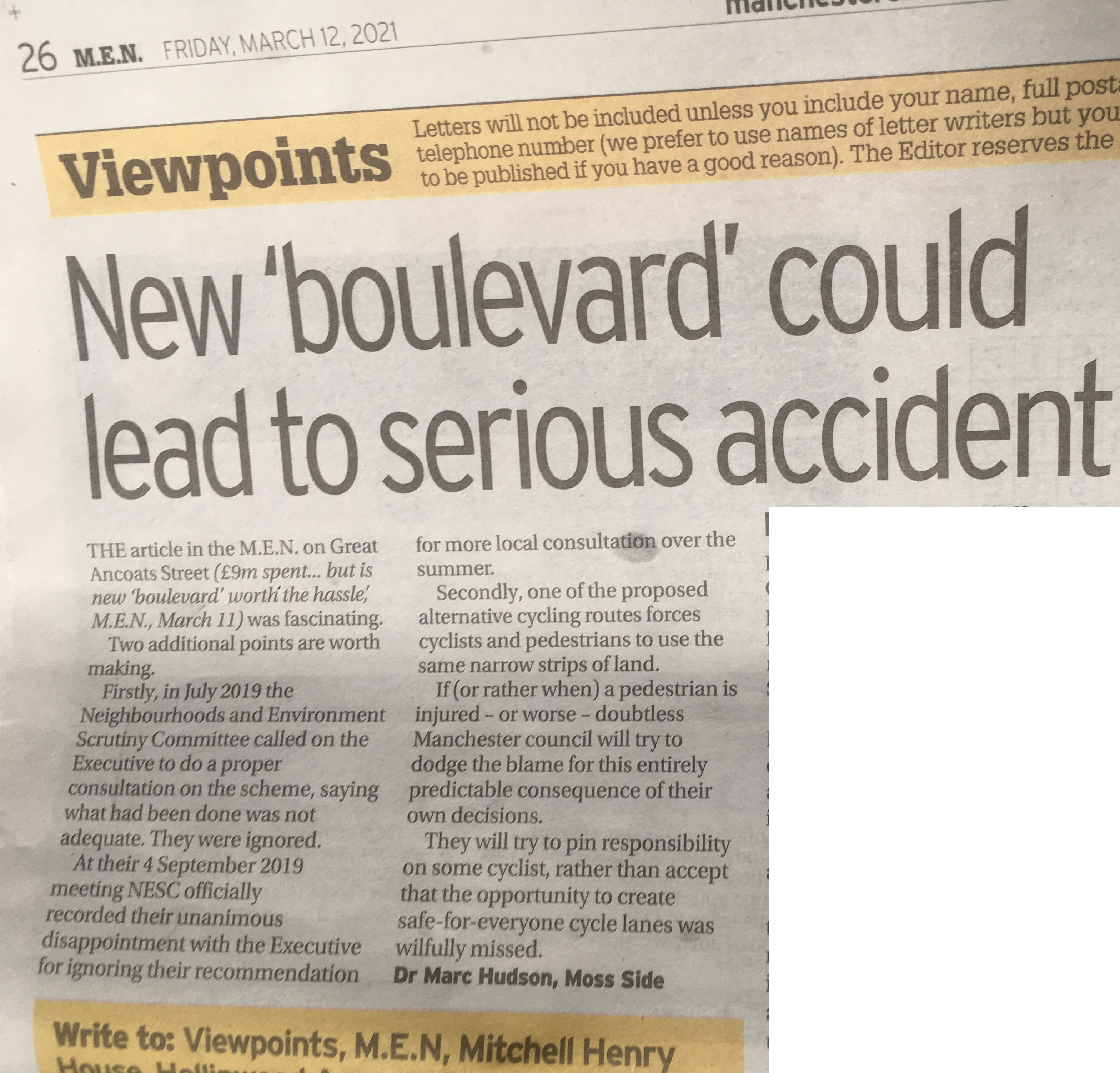 Secondly, one of the proposed alternative cycling routes forces cyclists and pedestrians to use the same narrow strips of land. If (or rather when) a pedestrian is injured or worse, doubtless Manchester City Council will try to dodge the blame for this entirely predictable consequence of their own decisions. They will try to pin responsibility on some cyclist, rather than accept that the opportunity to create safe-for-everyone cycle lanes was wilfully missed.