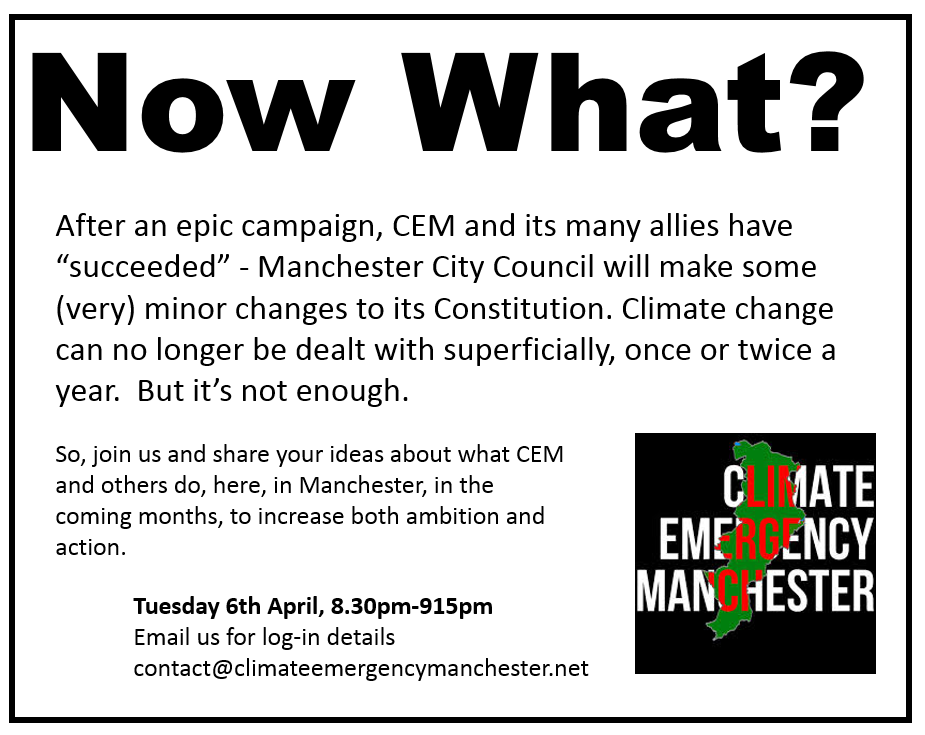 Climate Emergency Manchester has its Monthly Meeting on Tuesday 6th April from 8.30pm. It’s an opportunity for you to meet other people, compare notes, propose action. Email contact@climateemergencymanchester.net