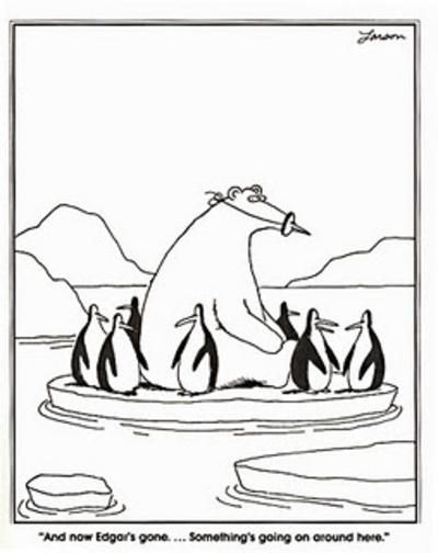 Meanwhile climate activists are reminding everyone that the idea of a personal carbon footprint was promulgated by BP, hoping to get people not to see them (best trick the devil ever played etc etc – one is reminded of the Far Side cartoon of the polar bear poorly disguised as a penguin…