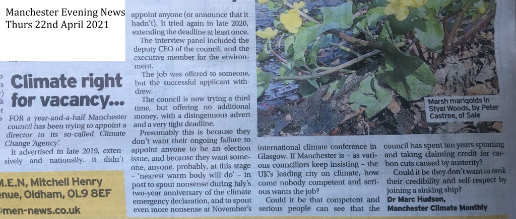 FOR a year and a half Manchester City Council has been trying to appoint a director to its so-called Climate Change “Agency.” It advertised in late 2019, extensively and nationally.  It didn’t appoint anyone (or announce that it hadn’t).