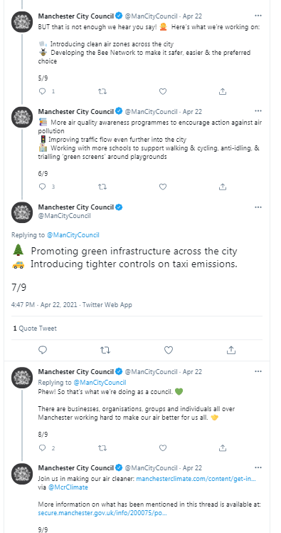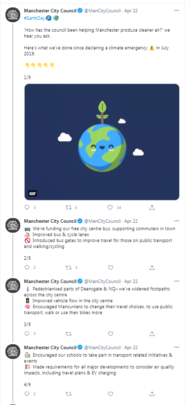 I have just seen some tweets sent from the Manchester City Council Twitter account on April 22nd (aka “Earth Day”). These were highly inaccurate and incomplete mischaracterisations of what the Council has done/not done in the last two years. That’s what we have come to expect.