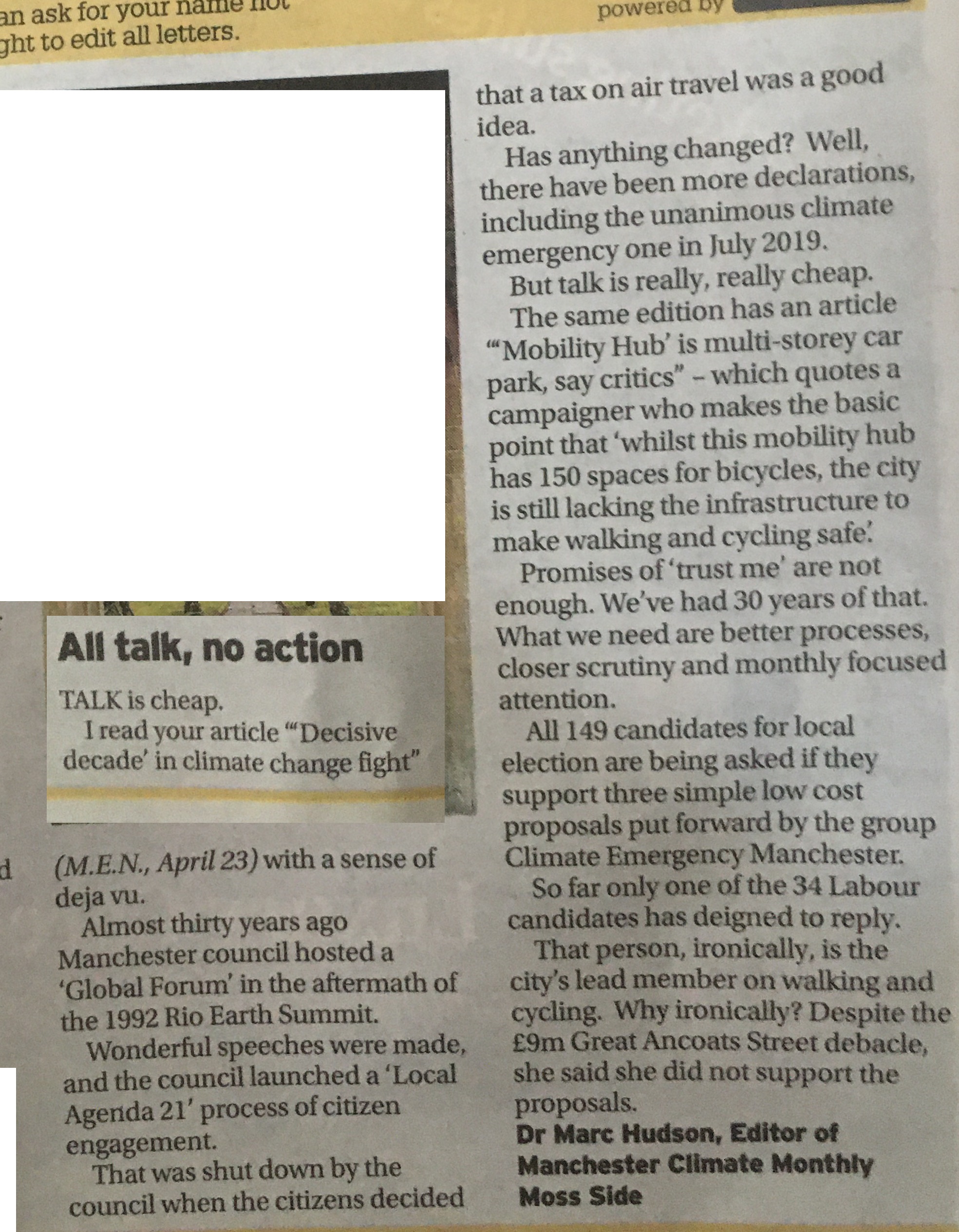 TALK is cheap.I read your article “‘Decisive decade’ in climate change fight,” M.E.N, 23 April) with a sense of deja vu. Almost thirty years ago Manchester City Council hosted a “Global Forum” in the aftermath of the 1992 Rio Earth Summit. Wonderful speeches were made, and the Council launched a “Local Agenda 21” process of citizen engagement. That was shut down by the Council when the citizens decided that a tax on air travel was a good idea.