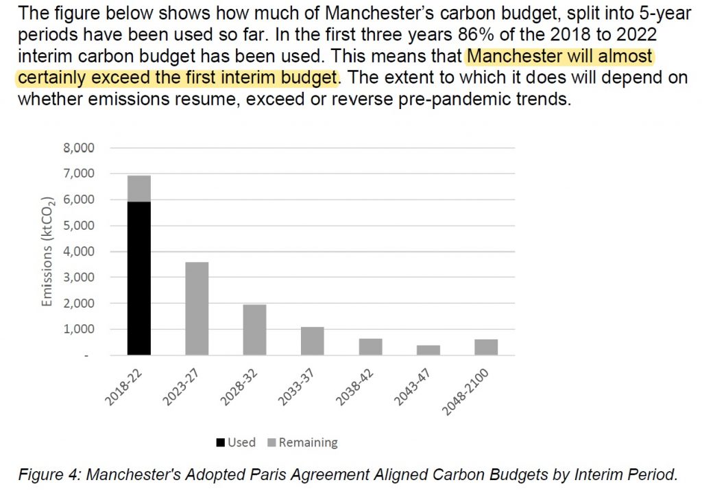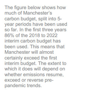 In 2018 Manchester City Council, the “independent” agency and a bunch of organisations it had corralled and called a “partnership” announced that Manchester was going to be net zero by 2038, 12 years ahead of the national target. It hired the Tyndall Centre to do some sums. The sums came back that the city had a 15 million tonne carbon budget for the rest of the 21st century.