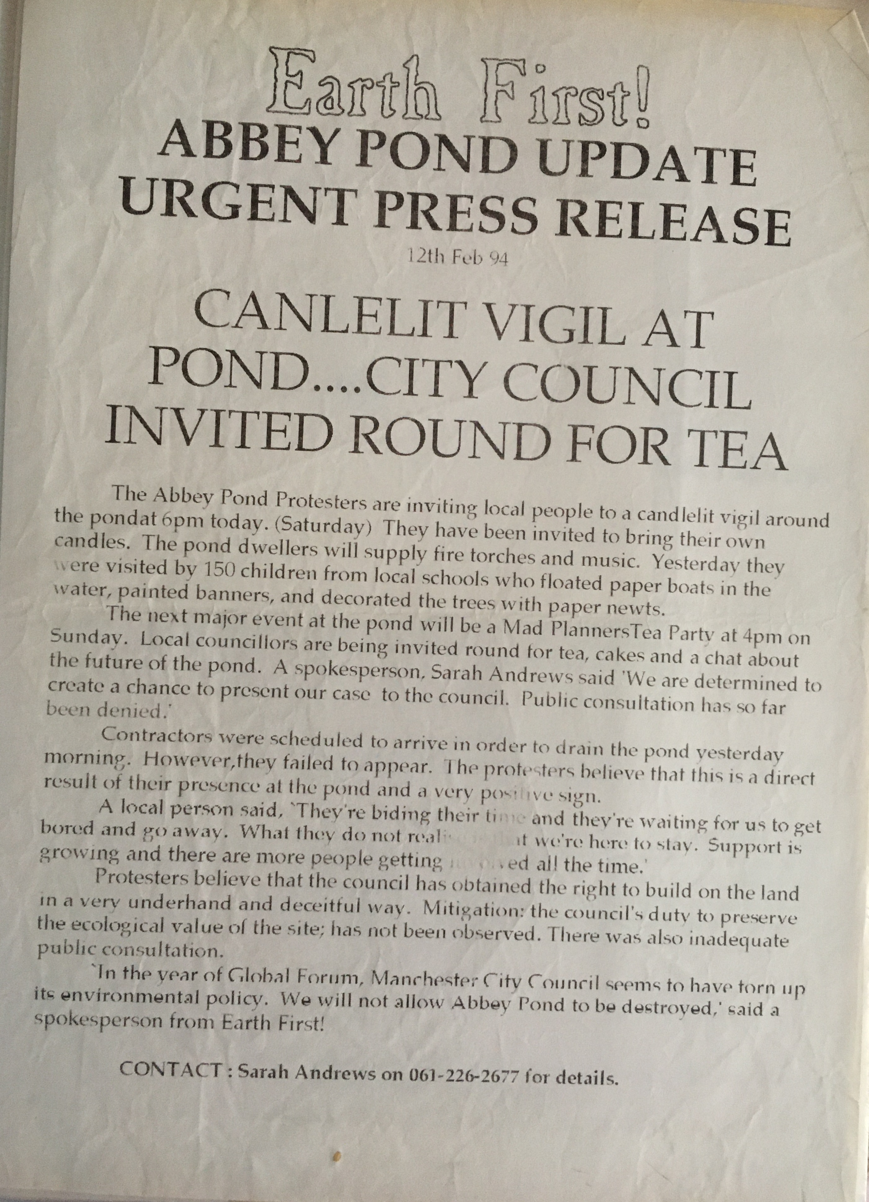 Every day from Friday 11th to Thursday 24th February, a post (sometimes two) will appear on this site, to celebrate the Republic of Newtonia – a brief occupation of a site in Hulme in defence of Abbey Pond (near the Old Abbey Taphouse). In 1994, local people and environmental activists tried to stop the Council and the Science Park from filling in the much-loved pond. If you were there, and want to share your memories (and any photos or other material) please do get in touch via mcmonthly@manchesterclimatemonthly or on Twitter – @mcr_climate