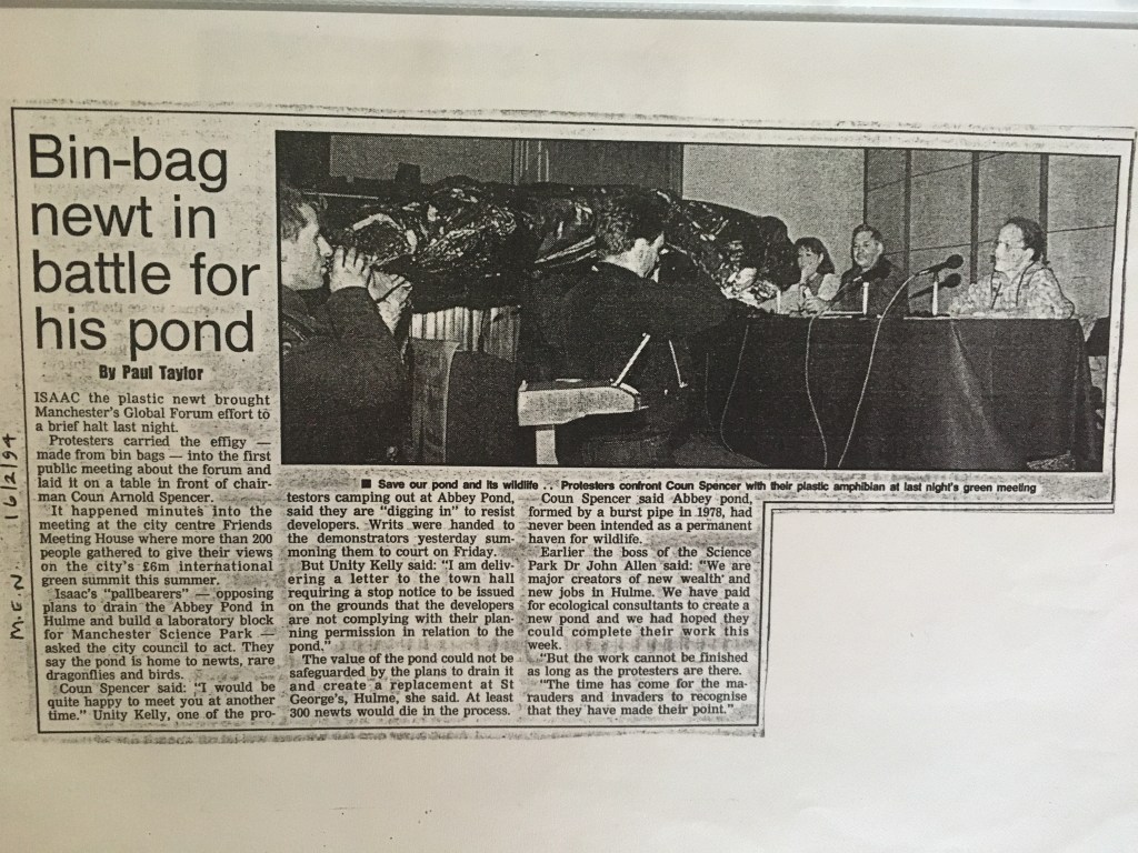 Every day from Friday 11th to Thursday 24th February, a post (sometimes two) will appear on this site, to celebrate the Republic of Newtonia – a brief occupation of a site in Hulme in defence of Abbey Pond (near the Old Abbey Taphouse). In 1994, local people and environmental activists tried to stop the Council and the Science Park from filling in the much-loved pond. If you were there, and want to share your memories (and any photos or other material) please do get in touch via mcmonthly@manchesterclimatemonthly or on Twitter – @mcr_climate