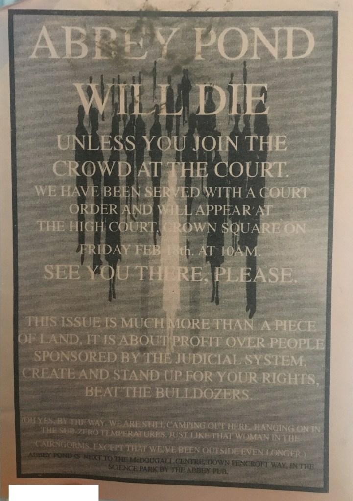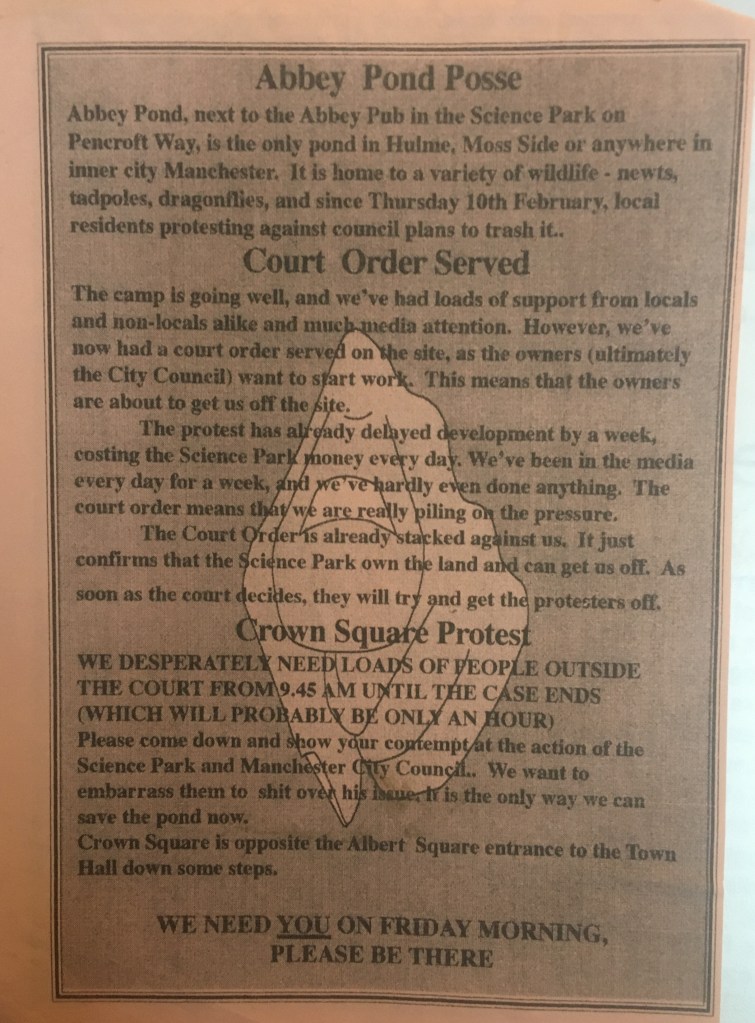 Every day from Friday 11th to Thursday 24th February, a post (sometimes two) will appear on this site, to celebrate the Republic of Newtonia – a brief occupation of a site in Hulme in defence of Abbey Pond (near the Old Abbey Taphouse). In 1994, local people and environmental activists tried to stop the Council and the Science Park from filling in the much-loved pond. If you were there, and want to share your memories (and any photos or other material) please do get in touch via mcmonthly@manchesterclimatemonthly or on Twitter – @mcr_climate