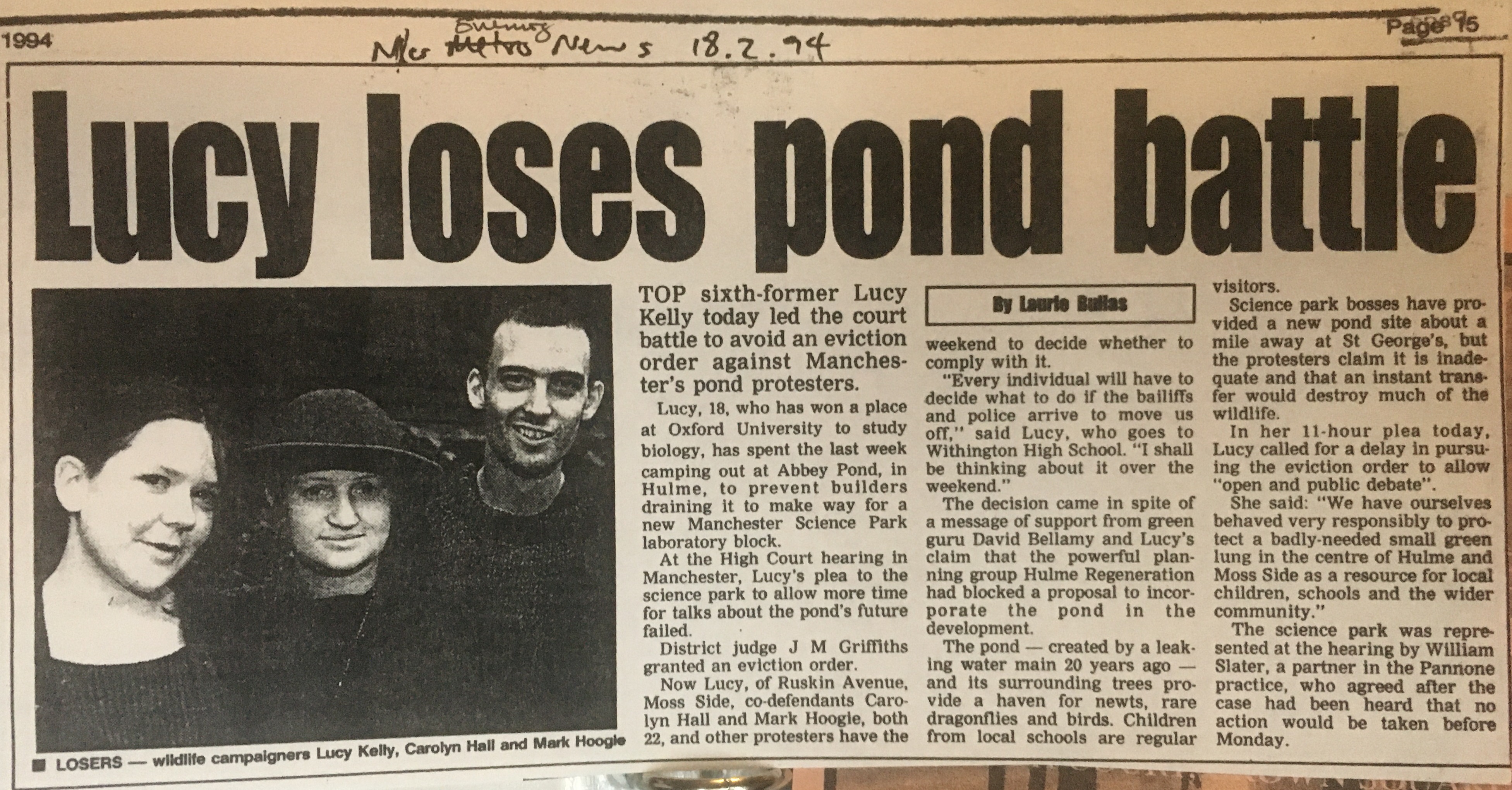 Every day from Friday 11th to Thursday 24th February, a post (sometimes two) will appear on this site, to celebrate the Republic of Newtonia – a brief occupation of a site in Hulme in defence of Abbey Pond (near the Old Abbey Taphouse). In 1994, local people and environmental activists tried to stop the Council and the Science Park from filling in the much-loved pond. If you were there, and want to share your memories (and any photos or other material) please do get in touch via mcmonthly@manchesterclimatemonthly or on Twitter – @mcr_climate