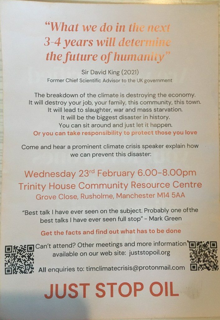 One of the attendees, an affable older chap, was there to try to recruit people to the fight over the Clean Air Zone in Manchester.  Or rather, to the fight AGAINST the Clean Air Zone.  He was keen to distribute the Just Stop Oil flyers, and equally happy to use the rhetoric of “scientists and politicians have been lying to us” to claim that air quality was fine, and that Andy Burnham is bringing this in as a personal wealth generator etc etc.