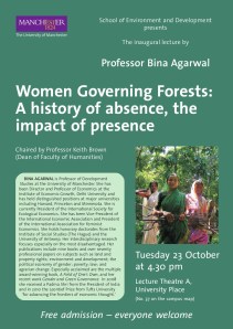 Tuesday 23 October, 4.30pm Women Governing Forests: A history of absence, the impact of presence Leture Theatre A, University Place, Oxford Rd