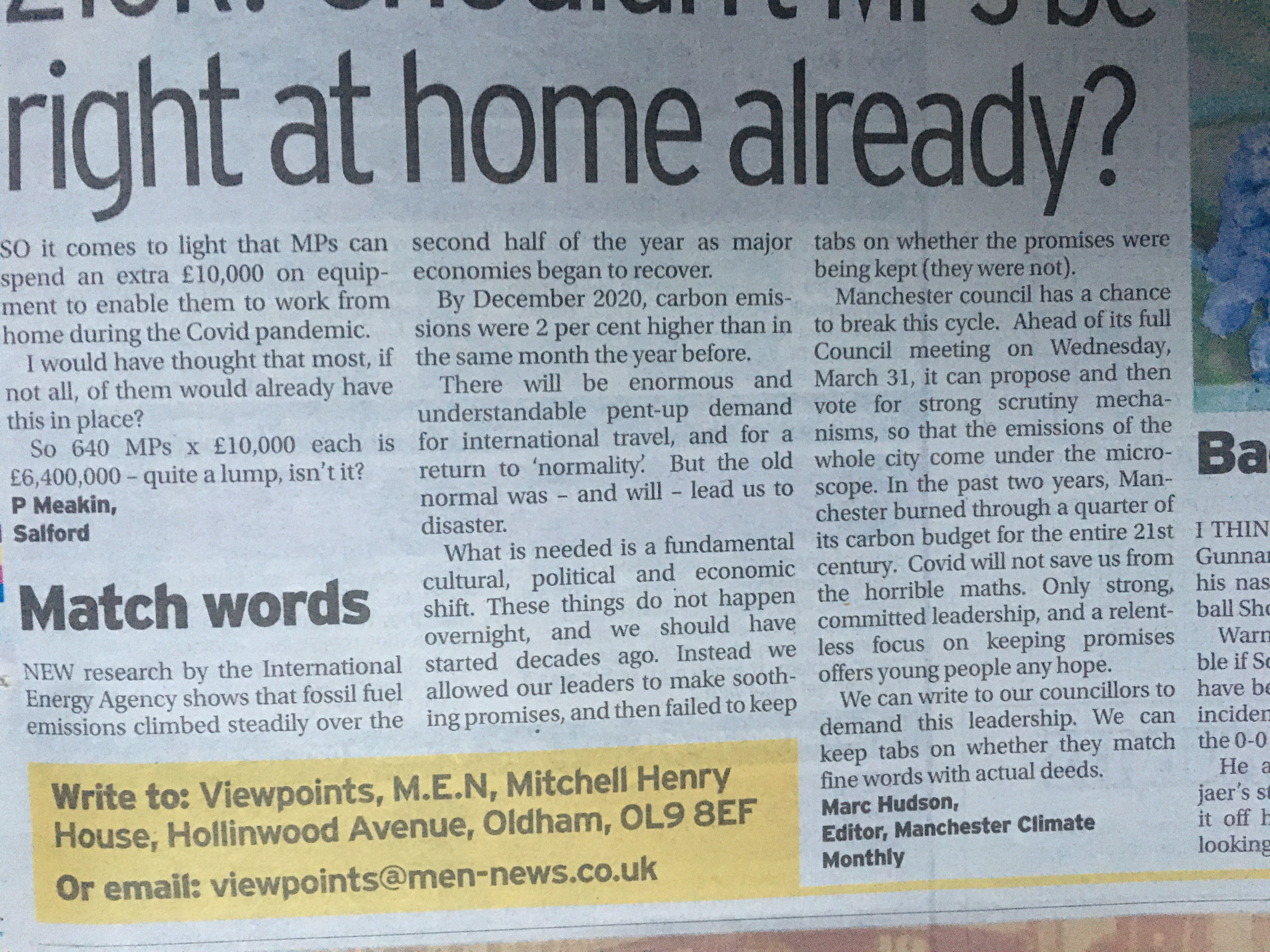 Manchester City Council has a chance to break this cycle. Ahead of its full Council meeting on Wednesday 31st March, it can propose and then vote for strong scrutiny mechanisms, so that the emissions of the whole city come under the microscope. In the last two years, Manchester burned through a quarter of its carbon budget for the entire twenty first century. Covid will not save us from the horrible maths. Only strong, committed leadership, and a relentless focus on keeping promises offers young people any hope for a decent adulthood.